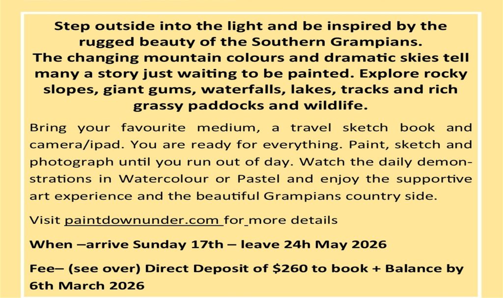 Please ensure you stipulate your name and Grampians on the payment and then forward or email the receipt to contact@paintdownunder.com.
